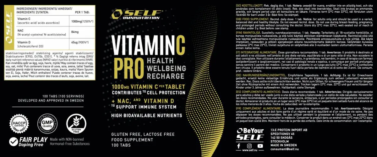 Fremmer immunsystemets normale funksjon, bidrar til produksjon av energi, bidrar til nervesystemets normale funksjon, reduserer følelsen av tretthet og utmattelse, 1000 mg per tablett